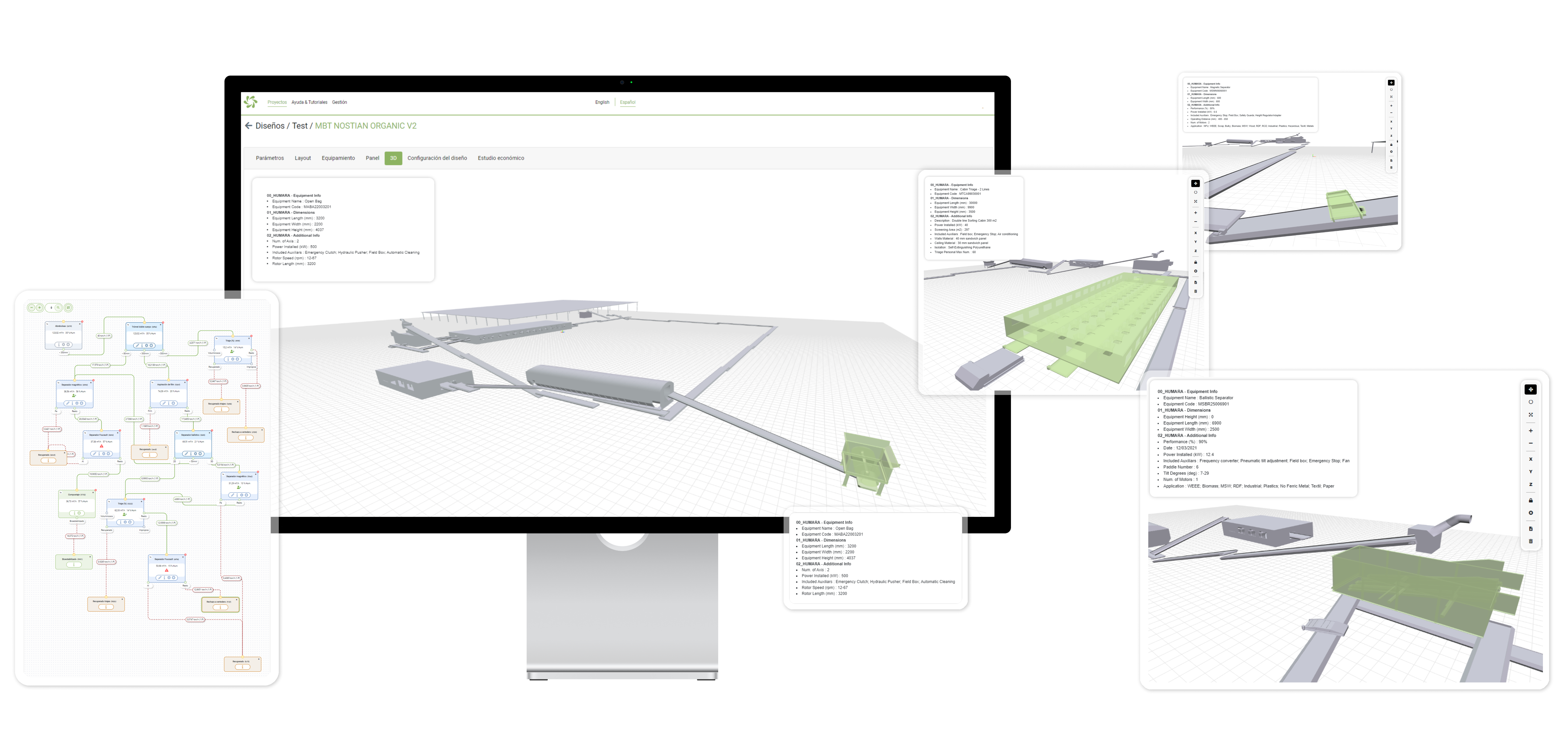 La plataforma también destaca por su versatilidad, permitiendo a las empresas diseñar plantas nuevas o existentes con un alto grado de personalización. Los usuarios pueden generar múltiples simulaciones para evaluar diferentes escenarios y optimizar el diseño según sus necesidades específicas. Además, la documentación técnica necesaria, como el balance de masas, listado de equipos, y otros indicadores clave, se genera automáticamente, ahorrando tiempo y reduciendo el riesgo de errores.