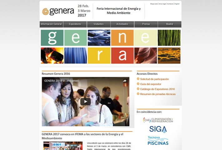 La edición 2017 de Genera se celebrará entre los días 28 de febrero al 3 de marzo, en coincidencia con C&R, Salón Internacional de Aire Acondicionado, Calefacción, Ventilación y Refrigeración, y por primera vez con SIGA, Feria de Soluciones Innovadoras para la Gestión del Agua, y con Tecnova Piscinas, Feria de Tecnología e Innovación para Instalaciones Acuáticas
