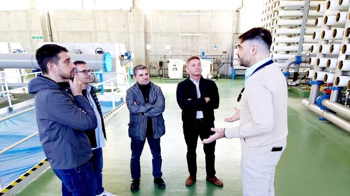 Alejandro Sturniolo, vicepresidente de la International Desalination Association (IDA); Javier Romero, vicepresidente de la Asociación Latinoamericana de Desalación y Reúso de Agua (ALADYR) y Domingo Zarzo, presidente de la Asociación Española de Desalación y Reutilización de Agua (AEDyR), visitaron una de las plantas más importantes de la provincia ubicada en la ciudad de Benidorm, acompañados por Juan Ángel Conca, Gerente General, y Carlos Aliaga, Jefe del departamento de proyectos, obras y explotaciones de la EPSAR (Entidad de Saneamiento de Aguas Residuales de la Comunidad Valenciana),