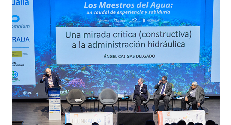 Ángel Cajigas realizó una mirada crítica, pero constructiva, a la administración hidráulica, de la que él mismo formó parte dentro de la Dirección General del Agua de distintos ministerios de medioambiente, con la que en la actualidad sigue colaborando. Según Cajigas, en las últimas décadas la administración hidráulica ha tenido que hacer frente a importantes retos en materia de agua. Sin duda, el más significativo ha sido y es la gestión de los recursos en situaciones de estrés hídrico. Se han acometido planes de desalación y de depuración y se ha avanzado en la protección del dominio público hidráulico. Pero, lejos de llevarse por el entusiasmo de los objetivos alcanzados, es necesario hacer un análisis de aquellos aspectos que requieren, a modo de ver del ponente, una cierta mejora en aspectos como: la planificación hidrológica reconoce un déficit estructural, pero no se ejecuta más allá del 30 % de las infraestructuras necesarias; el régimen económico financiero de la ley de aguas no permite hacer frente a los gastos y no se ha sido capaz de estructurar un nuevo modelo de financiación; la propia estructura administrativa no se corresponde con los retos que hay que afrontar siendo imprescindible una administración reforzada con un capital humano más motivado, etc.